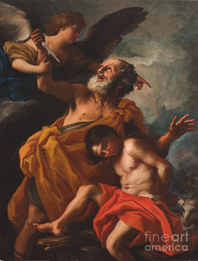 The family grew together, and Isaac became a young man. God then appeared to Abraham again with an unconscionable order. He was to sacrifice his son Isaac back to Himself. Abraham, not understanding but obeying, took him to the mountain for the sacrifice. Just as he was about to plunge the knife into his son’s tied body, an angel appeared and told him to halt, ordering him to sacrifice a nearby ram instead.