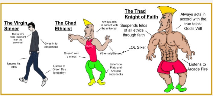 This brings incredible issues to resolve, as it would seem this philosophy is more a sophistic rationalization to act in deeply immoral ways than living for a higher purpose. One has to wonder whether there is such thing as universal ethics exists if the man of faith steps right over it. Still, if one looking at history and the struggles of life, there’s logic to it. Sometimes the faithful man is forced to act in a way where it's hard to differentiate him from a tyrant. Think of the man who must rebel against his government, leaving to the deaths of countless people, because of a vision of the future if he does nothing. Think of the only child who defies the wishes of his parents, possibly leaving them destitute in old age, to become a missionary in a foreign land. Think of the peasant woman who has a vision to command a great army and push out invaders. There are situations that no ethical code, no matter how robust, is able to give direction for. Situations that make one look like a madman. Even with the most internally cohesive moral system, there are times they must be broken for the greater glory of God.